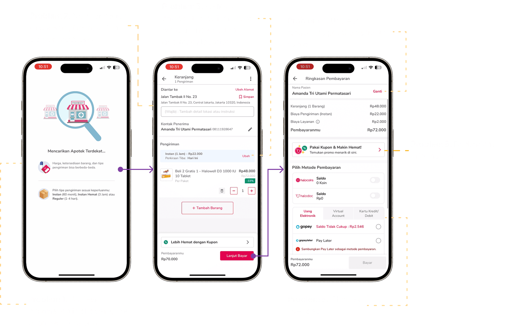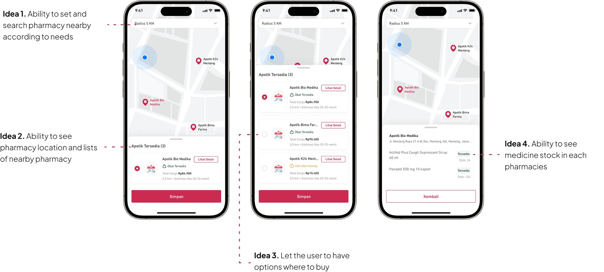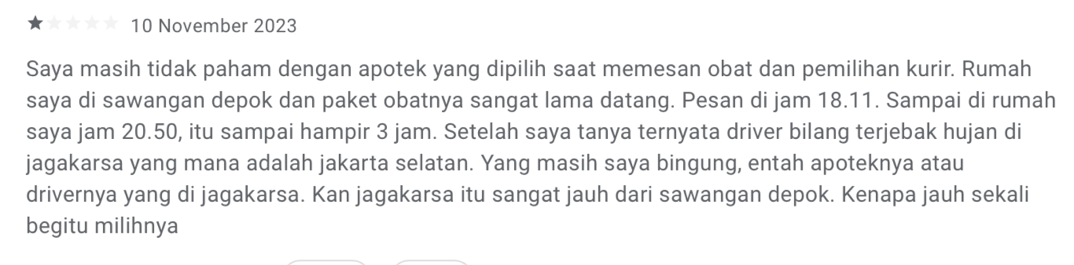 Feedback gathered from desk research in the App Store and Play Store for the Halodoc app indicated that users were mostly frustrated by the uncertainty of pharmacy locations and the limited ability to track drivers while buying medicine online.