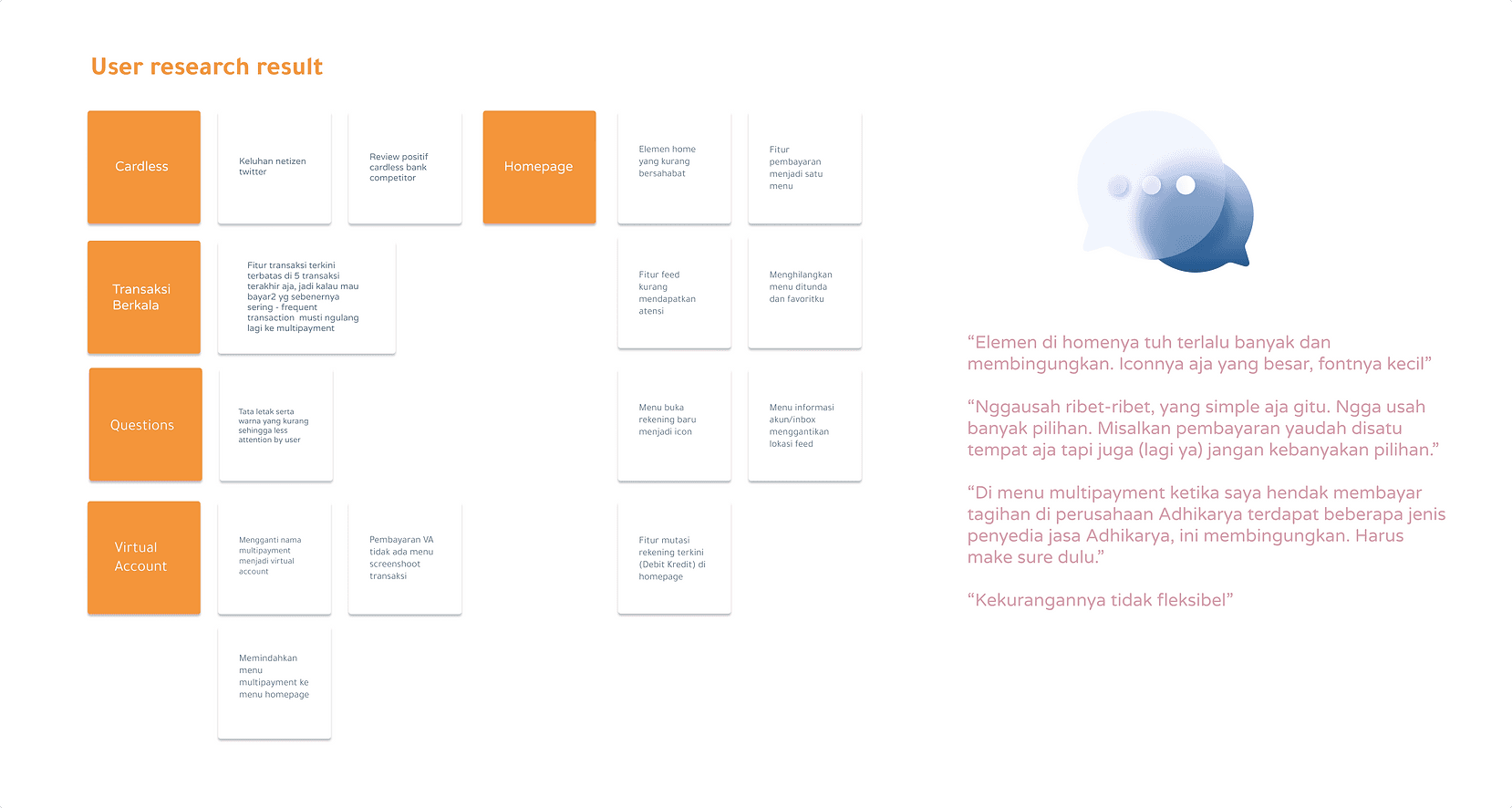 Primary research were done through interviewed to six participants. Based on the findings, the results to the most problems users had experienced in using Mandiri Online are the flows to make a payment from the multipayment features, the interface as the icons were too big or the fonts were too small, and simplicity to make a payment.